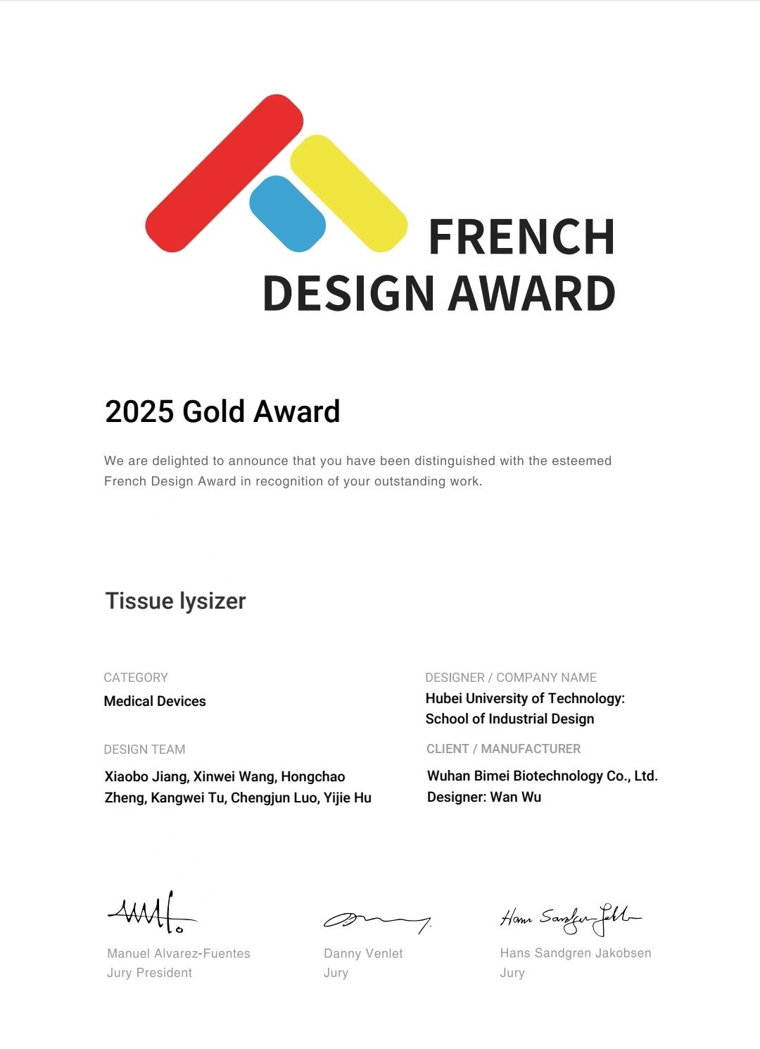 近日,2025 年French Design Award(法国设计奖)评选结果正式揭晓,威廉希尔体育姜晓波老师带领的研究生团队与企业合作研发的 Tissue Lysizer (研磨设备 - 裂解仪), 成功斩获2025年度法国设计奖金奖。法国设计奖,又名法国FDA 设计奖,是国际公认的全球工...