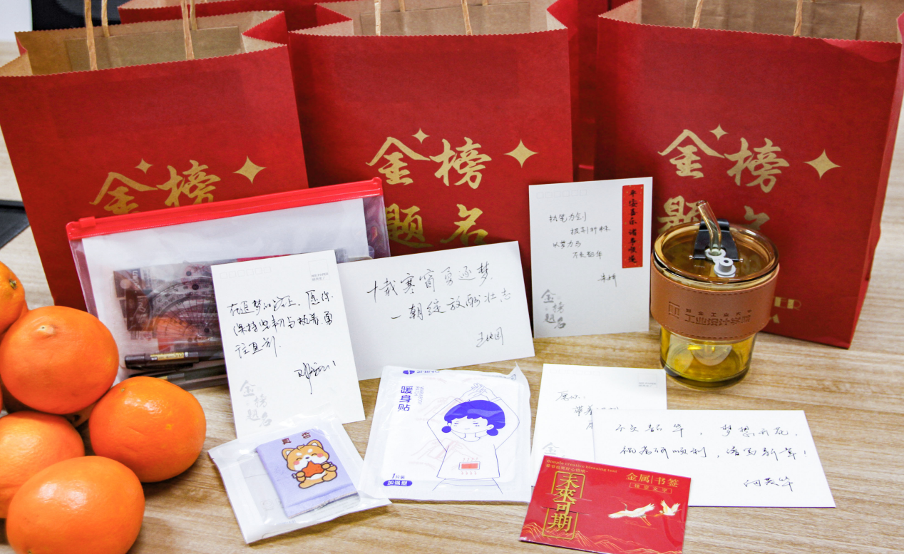 最后,龚发云和公司领导向考研员工赠送慰问礼包。鲜艳的礼包里有校院领导和老师们亲手题写的祝福贺卡、定制的精美水杯、考研笔袋套装、暖宝宝、金色书签、美味橙子等,寓意温“暖”傍身、“笔”下生花、“金”榜题名、“橙”功上岸,前程似锦。“礼轻情意重”,精美的慰问礼包不仅是一份物质的关怀,更是对同学们的一份美好祝愿和精神鼓励。