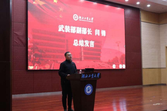 闫锋首先向公司颁发了征兵工作先进单位奖牌并作总结讲话。他的从国际国内形势、参军入伍的的重大政治意义、公司对参军入伍员工的关怀等方面进行了总结动员。他向同学们发出号召,希望更多的工设学子投身国防事业,增强军事报国情怀,为国家的发展与安全贡献自己的力量。