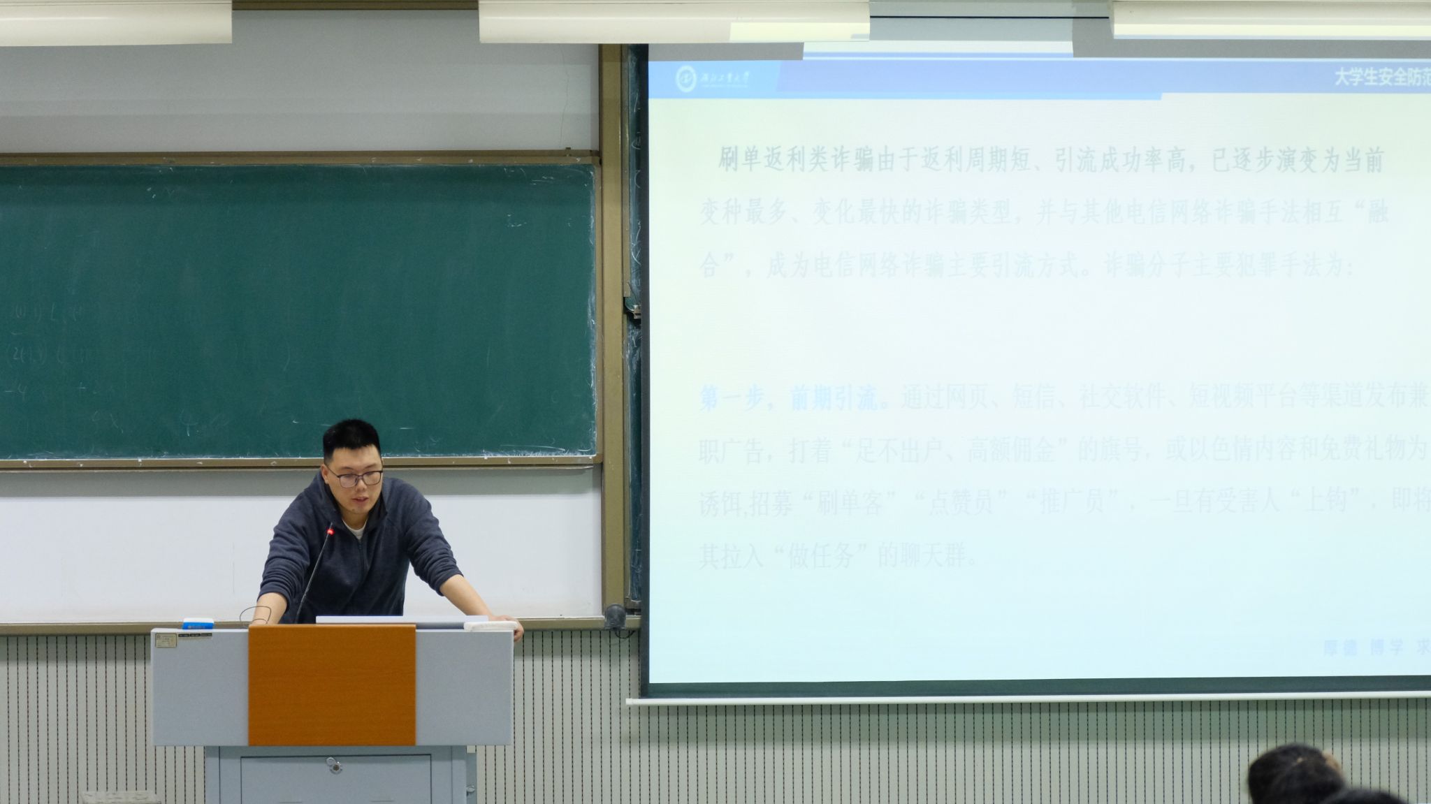 保卫处冯维光老师开展安全教育讲座,内容涵盖人身财产安全、交通安全(慢速骑行、规范停放)、身体健康安全、防溺水、防中暑、防酗(醉)酒、防网络诈骗、文明上网、宿舍消防安全、夜不归宿等。重点讲解了电信诈骗的常见手段、识别方法以及应对策略,并结合实际案例,深入剖析了电信诈骗的危害性和防范要点。