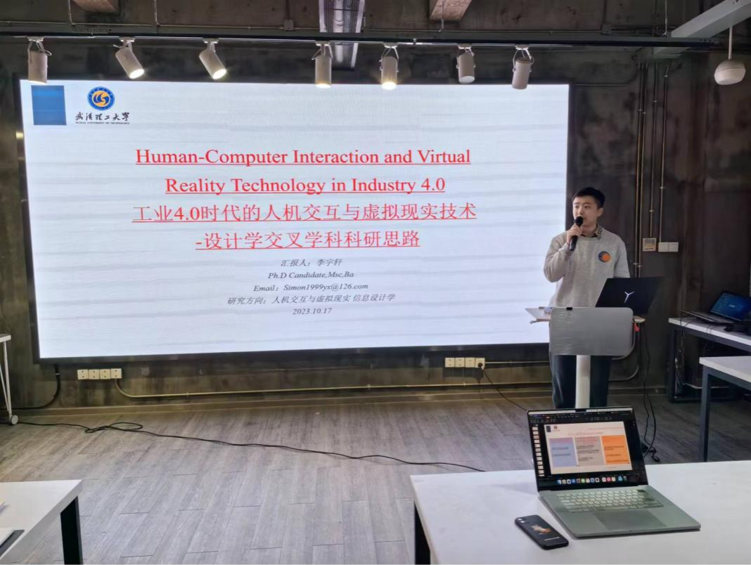 李宇轩以《工业4.0时代的人机交互与虚拟现实技术-设计学交叉学科科研思路》为题,从研究者功利性视角下设计学研究划分与起步、工业4.0时代的人机交互与虚拟现实技术两个大的方面展开分享,详细介绍了设计学研究的定义和类别以及工业4.0时代下最新的一些人机交互与虚拟现实技术,为同学们在人工智能时代背景下开展设计学交叉学科研究带来了很大启发。
