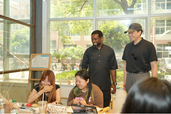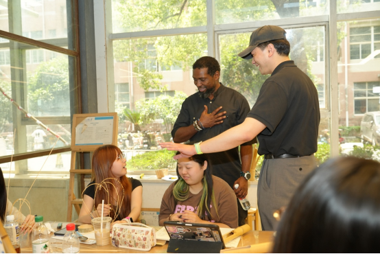 马纳梅拉首先来到公司一楼工作坊正在上课的24中美2班课堂,该班正在学习手工艺设计课程,使用竹子作为材料进行创作,马纳梅拉先生对员工的作品非常感兴趣,并且英语与员工进行了简单的交流。施琦老师向其介绍了公司的教学环境以及使用环保的竹质材料进行可持续教学情况。