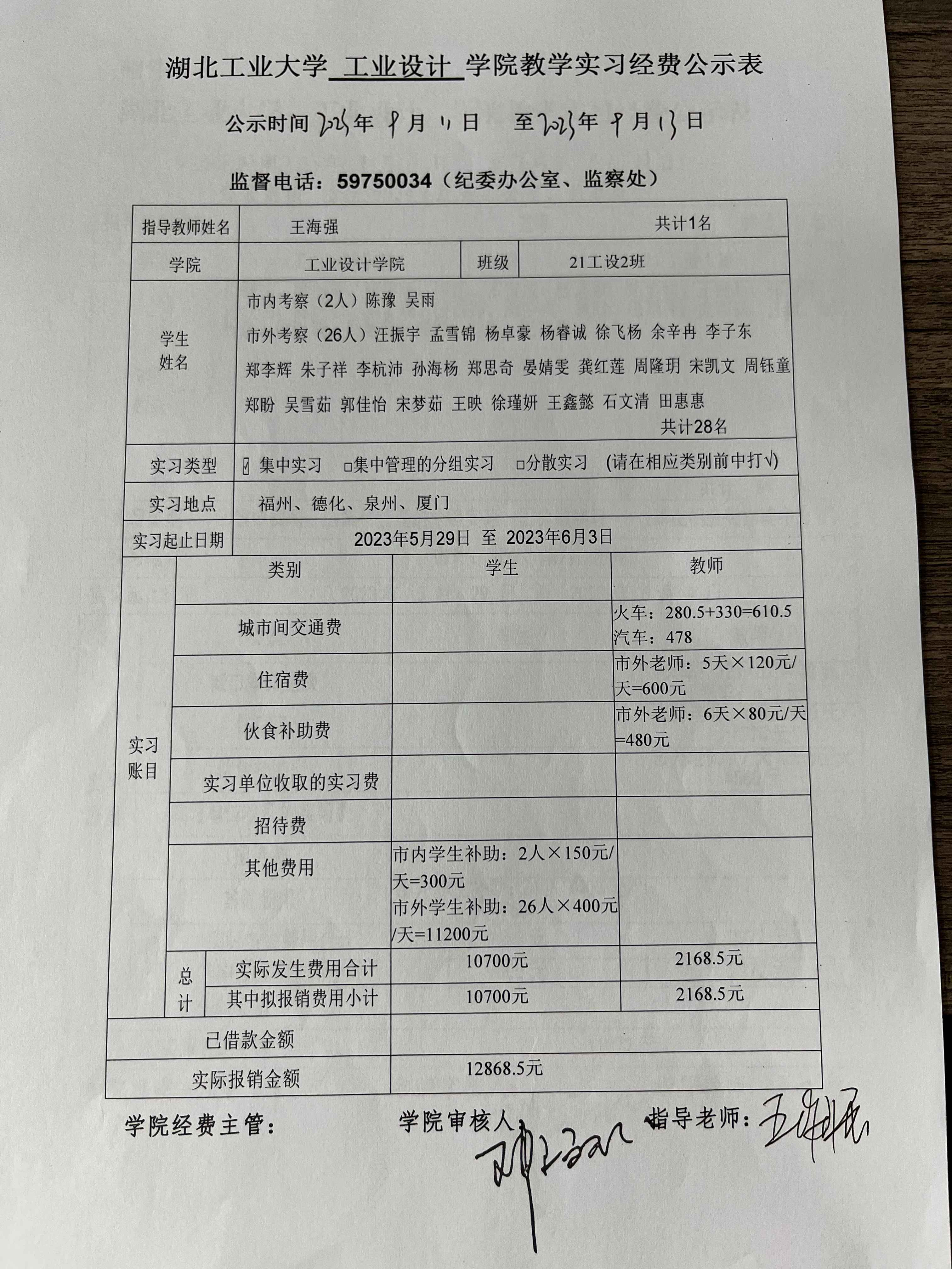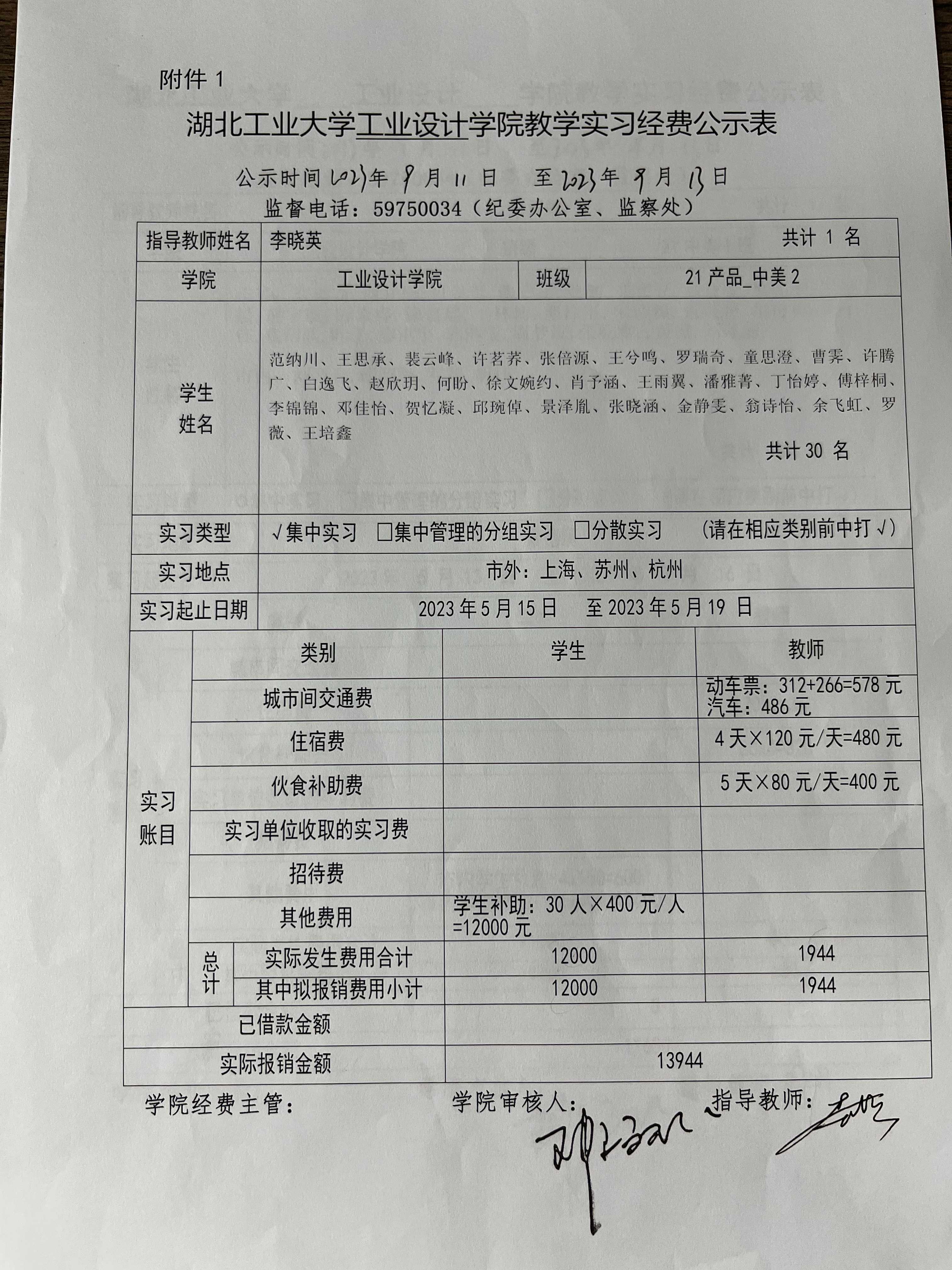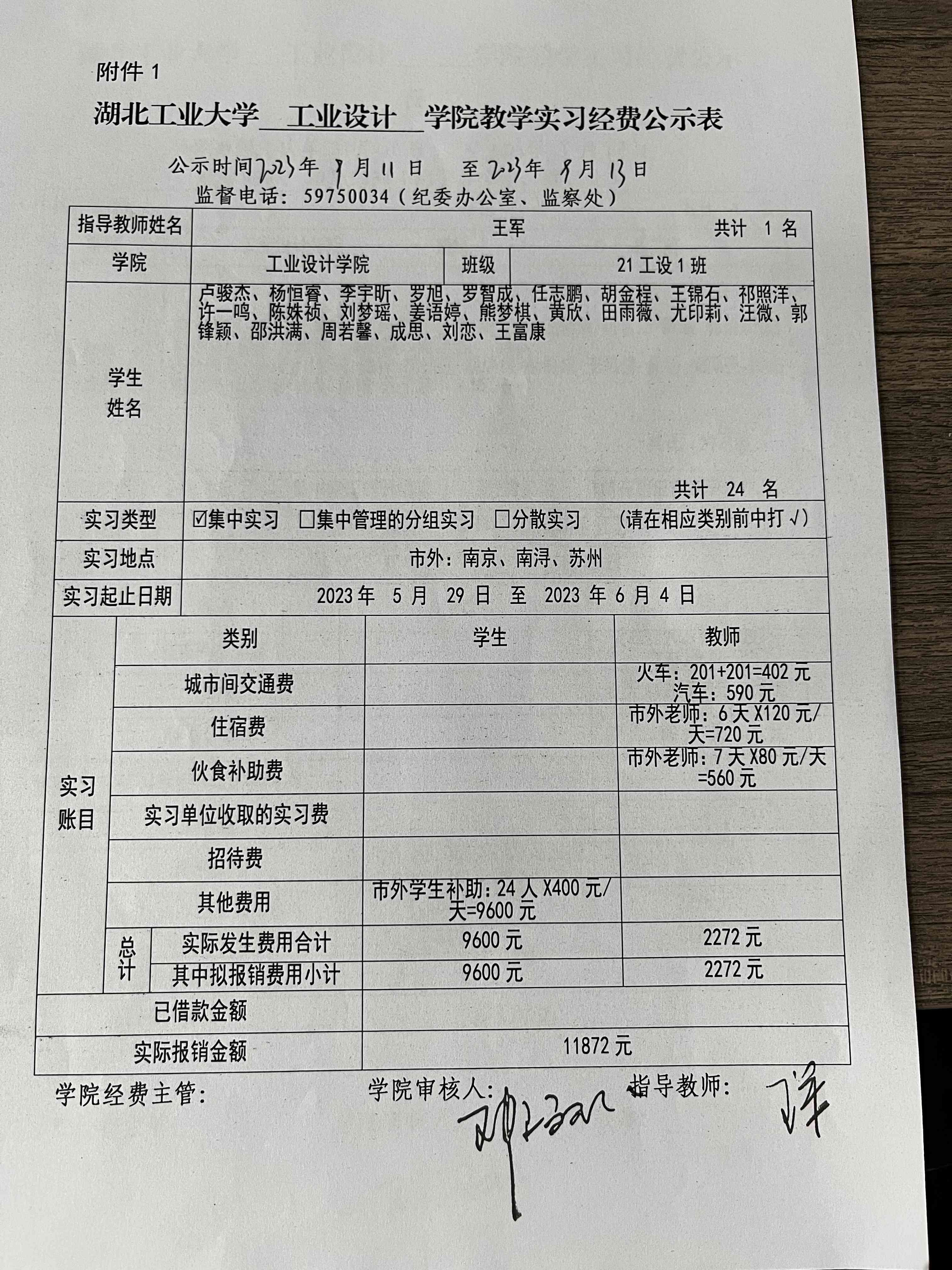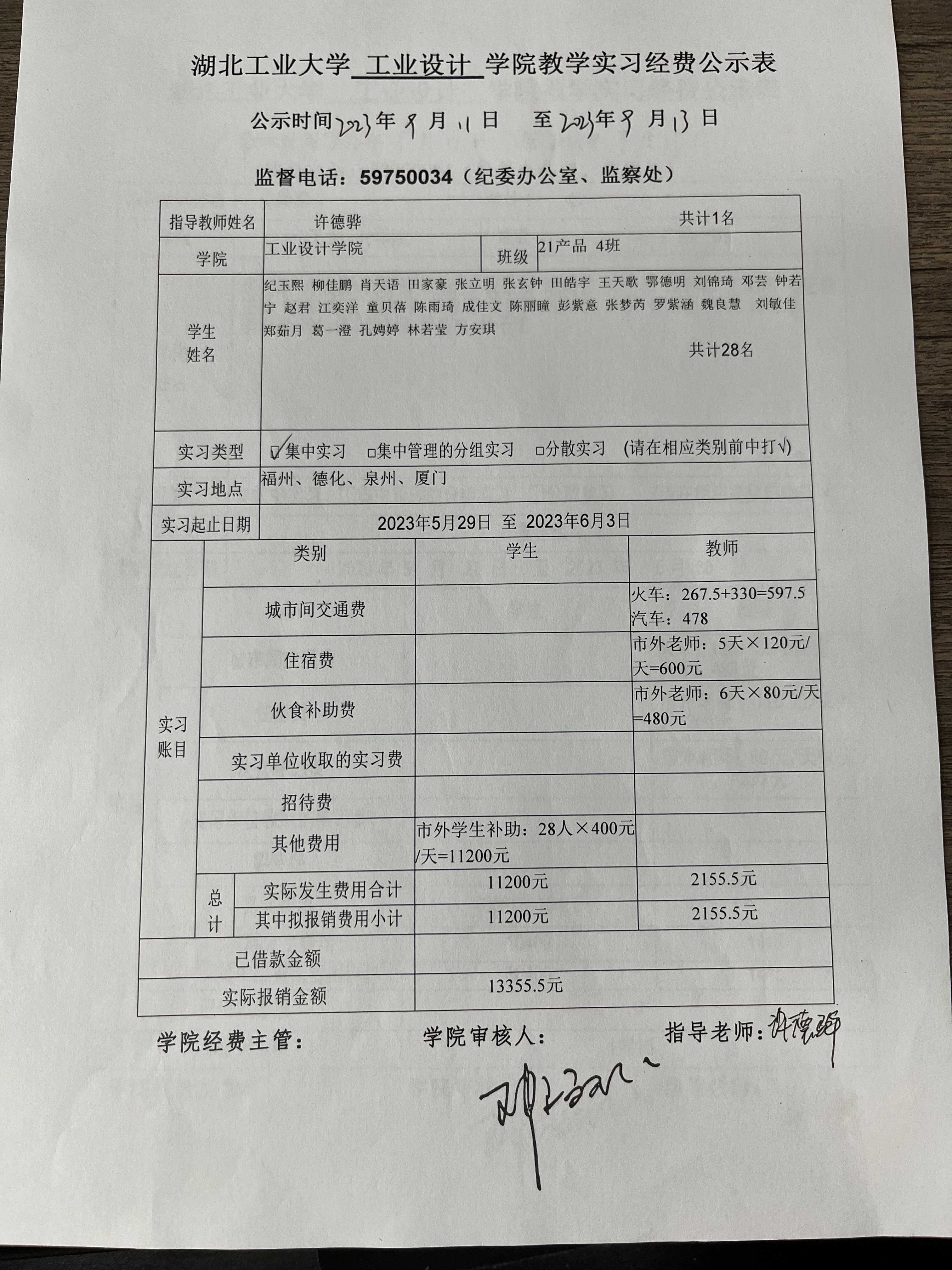 2021级《设计考察(二)》生产实习经费公示表